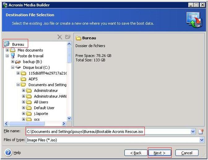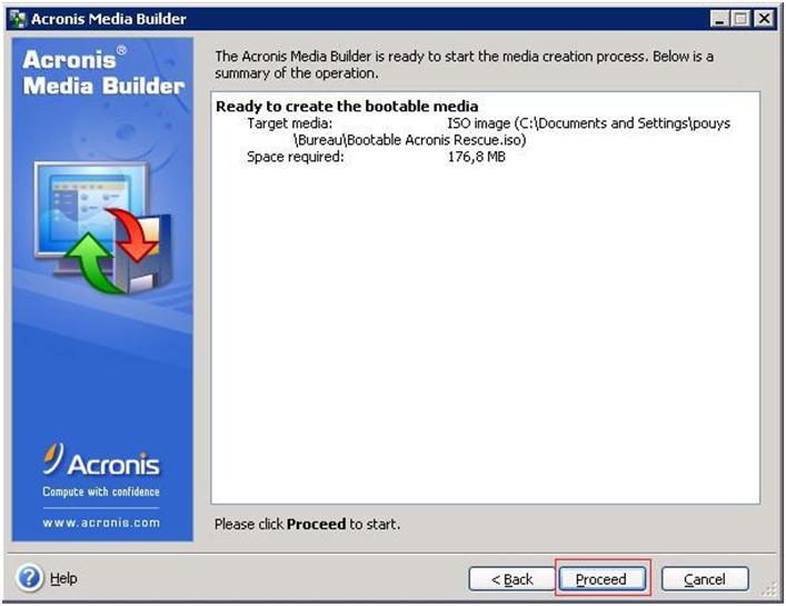 Nous choisissons aussi de graver L’agent bootable d’Acronis. Si une image doit être restaurée, il suffit de booter l’agent a partir du CD, puis tout sera géré a partir de la console de management.